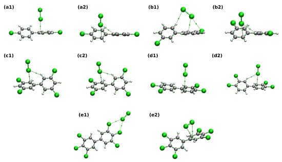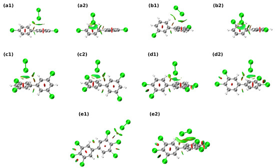 Figure 5. Graphical representation of the Non-Covalent Interactions (NCI) index distribution in the 1:1 PCB-chlorine complexes. Subfigure labels (ae) identify the PCB compound according to Scheme 1, while numbers 1 and 2 differentiate between two initial structures subjected to optimization. Color coding for atoms: gray—carbon, white—hydrogen, green—chlorine.
