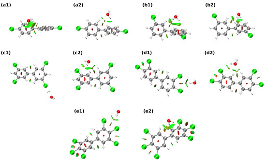 Figure 4. Graphical representation of the Non-Covalent Interactions (NCI) index distribution in the 1:1 PCB–water complexes. Subfigure labels (ae) identify the PCB compound according to Scheme 1, while numbers 1 and 2 differentiate between two initial structures subjected to optimization. Color coding for atoms: gray—carbon, white—hydrogen, red—oxygen, green—chlorine.