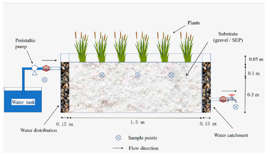 The substrates and particle sizes in the two constructed wetlands were as follows: (1) W-G was 1–2 mm gravel and (2) W-S was 1–2 mm T-SEP. Iris pseudacorus L., which has developed a root system, strong resistance to pollution and clean pollution, and salt and alkali resistance [25], was selected as a wetland plant in this experiment.