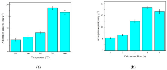 Figure 2b showed the adsorption capacity of T-SEP at a calcination temperature of 700 °C and a different calcination time (one, two, three, four, and five hours). It could be observed form Figure 2b that prolonging the calcination time was beneficial to improving the adsorption performance of T-SEP before the calcination time reached 4 h. The adsorption capacity would be decreased in case the calcination time exceeded 4 h. The calcination temperature of 700 °C and calcination time of four hours were selected to be the optimum parameters for subsequent experimental research.