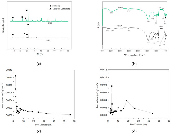 As shown in Figure 3c,d, the pore size distributions of SEP and T-SEP are mainly mesopores between 2–50 nm, with a small number of micropores and macropores. Compared with N-SEP, the number of micropores in T-SEP decreased, whereas the number of macroporous and mesoporous pores increased, which could be ascribed to calcination. Owing to the removal of adsorbed, bound, and crystal water, the number of mesopores and macropores increased.