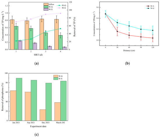 The variation of TP concentration along the way of W-G and W-S is shown in Figure 5b. The total phosphorus was rapidly adsorbed and degraded in the first quarter of the system, which decreased from the initial 0.48 mg·L−1 to 0.16 mg·L−1, accounting for 72.73% of TP removal in the constructed wetlands. This indicated that in the front of the reactor, the absorption of substrate, the absorption and transformation of plants and the assimilation of microorganisms happened very violently. The TP removal in the second half of the constructed wetlands was mild, mainly to ensure the stability of effluent water quality.