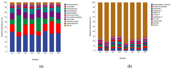 The relative abundance of microbial community (A01, A02, A03 and A04 are samples of W-S in summer, autumn, winter and spring, respectively; A05, A06, A07 and A08 are samples of W-G in summer, autumn, winter and spring, respectively): (a) Phylum level; (b) Genus level.