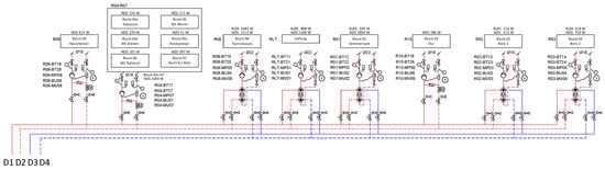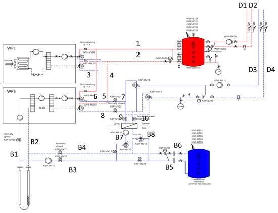 | Cold generation and distribution by the air–water heat pump (reversible operation) | 5 7 D3 D4 8 6 |
