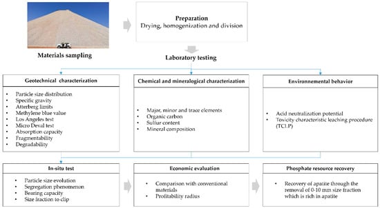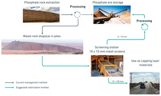 The Moroccan phosphate mining industry has followed a classical linear production process in which wastes are continuously generated and stock-piled in dumps and tailing storage facilities []. These wastes are generally considered as a source of pollution and must be handled accordingly, which also comes with additional management costs. The transition from the current linear conception model to a circular economy approach requires integrating novel mining procedures for waste management such as material sorting and classification. The purpose is to close loops and to simultaneously safeguard natural resources. Novel sustainable and eco-friendly solutions are required to minimize waste generation and societal impacts, to optimize energy consumption, to decrease the possible environmental impacts on air and water, and to encourage the valorization of produced waste.