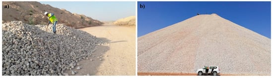 (a) Close up photo of SWR materials; (b) Screening waste rock piles (0–100 mm) of the phosphate mine site of Benguerir (Morocco).