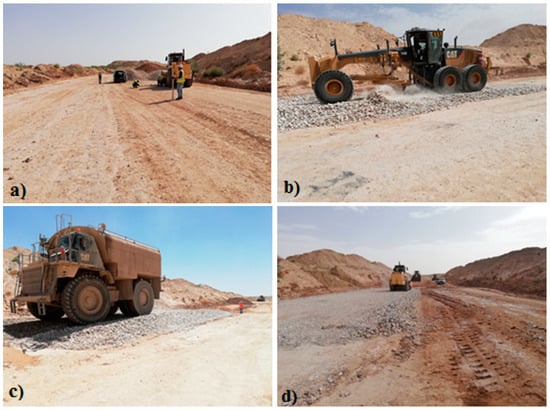 In this section, the results obtained from the field investigations are analyzed and the behaviors of the tested SWR materials under real working conditions are also assessed. Both construction phases and engineering machines carried out for the construction of the two full-scale field tests have been described in Figure 5.