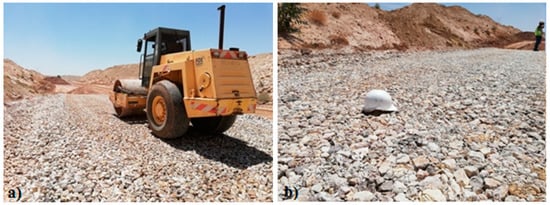 The field experiment on the 25–100 mm aggregates shows the great difficulty of compaction and the tendency of the separation of the grain boundary due to the phenomenon of generalized segregation, which concerned practically all of the surface of the layer (Figure 6). This poor granular arrangement observed can be explained primarily by the lack of fine aggregates, and one can add the difference in size and density of the particles to this. This phenomenon of segregation is detrimental to the mechanical properties of the used materials and can cause short- and long-term bearing defects. As a result, the proposal to use the 25–100 mm fraction of screening waste rock in the capping layers was rejected. Furthermore, the presence of fine elements developed after compaction significantly reduced the extent of the segregation phenomenon on the 10–100 mm aggregate size grading trial section. However, it is highly advisable, for the future realizations of the capping layer, to operate the mixing of these materials using a crawler bulldozer, which was not programmed during this field test. This can lead us to eliminate the coarse aggregates of 50–100 mm which prevent the correct spreading of the platform.