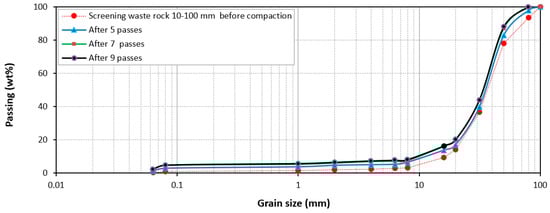 Figure 7 illustrates the grain size evolution of the SWR (10–100 mm) under the compaction energies developed by 5, 7, and 9 passes of the compactor. It is noteworthy that D50 has decreased from 37 mm to 35.34 mm and 33.8 mm under 5, 7, and 9 passes, respectively. It has been also seen that the 20–100 mm size grading remains the most affected by the granulometric evolution. The passes at 80 µm evolved from 1.05% before implementation to 2.79%, 4.61%, and 4.77% after 5, 7, and 9 passes of the roller compactor, respectively. Furthermore, a slight evolution in passing at 2 mm after compaction was also observed. With a Cu of 3.6 and a Cc of 1.88, the particle size curve of the SWR (10–100 mm) after 7 passes of the compactor is well spread out and well graduated. In this research, the fine activity of 10–100 mm size grading has been assessed using the methylene blue adsorption method. Based on this, the MBV value obtained on the 0–5 mm fraction of the sample taken after 7 passes was 0.22 g/100 g. Hence, an evolution of 4.8% after compaction process was observed. Based on the analysis of the gradation and MBV results above, the following points can be concluded: