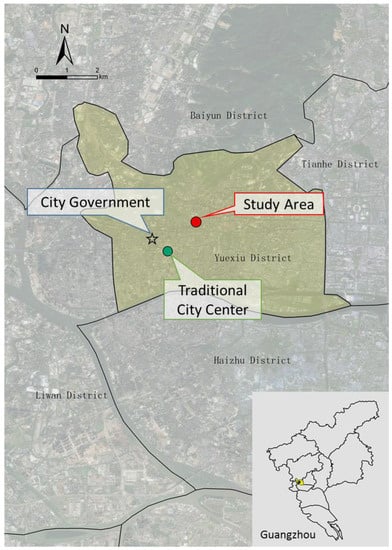 This paper is based on an urban renewal project (Project N) located in the center of Guangzhou, the capital of Guangdong Province (Figure 1). “N” stands for the trademark of the former state-owned power-transmission equipment factory on the site. Guangzhou has been selected as the case because of its long history, high level of economic development, and deep-rooted tradition of collectivism in state-owned enterprises (SOEs). Such a city can trace its history back to 214 BC when Ren Xiao, General of the Qin Dynasty, built the Ren Xiao Fort as the very first stronghold in the area. Guangzhou was also one of the main starting points of the famous South China Sea Silk Route used in the Qin and Han dynasties []. Over the past two thousand years, the area around the Beijing Road—the location of Project N discussed in this paper—has long been the traditional center of the city, and had never waned as such until recent years (Figure 1). In 2018, President Xi Jinping visited Guangzhou and put forward that the city should pay more attention to urban redevelopment and revitalize its socioeconomic development.