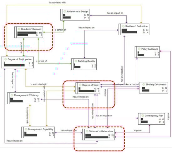 The qualitative results revealed the most influential factors related to social risks by using the method of ATLAS.ti coding. Based on the notes taken from interviews and responses to open-ended questions in the questionnaire, Figure 4 shows how ATLAS.ti uses a visual perspective to present the relationship between different factors. The coding process is in line with the conceptual framework presented in Table 1, and all the choices in the table are carefully examined. The main purpose of the process is to pinpoint the fundamental risk sources among the multifarious options. There are three kinds of relationships between the factors. The yellow line in the diagram indicates that two connected parties are related; the purple line indicates that one side influences the other side; the pink line means that one side promotes the other side; and the green line means that one side contains the other side. In each box, the “G” value and “D” value are also displayed, and refer to the number of occurrences in the notes and the number of other connected factors, respectively. Figure 4 shows that “residents’ demand” has the highest G value (179), while “status of collaboration” and “degree of trust” have the highest D value (7).