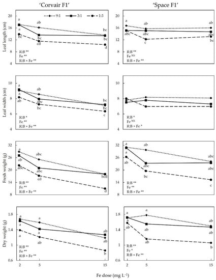 | R:B light ratio × Fe dose | ** | ** | ** | NS | * | |