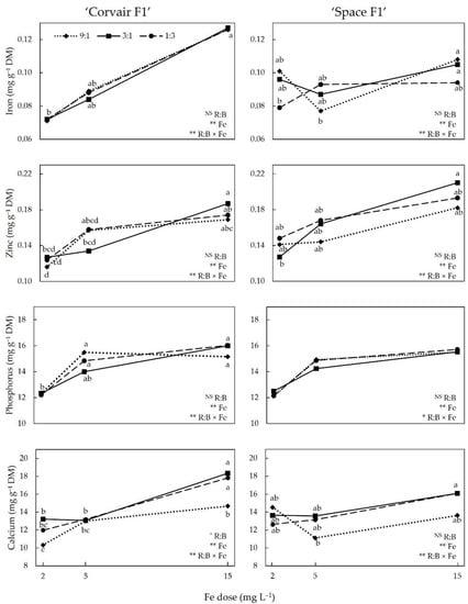 | R:B light ratio × Fe dose | ** | ** | ** | NS | NS | |