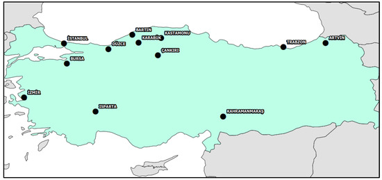 The material of the study was composed of the curriculum and all of the course syllabi offered at the undergraduate level in 12 universities teaching forest engineering in Türkiye (Artvin Çoruh University, Bartın University, Bursa Technical University, Çankırı Karatekin University, Düzce University, İstanbul University-Cerrahpaşa, Isparta University of Applied Sciences, İzmir Katip Çelebi University, Kahramanmaraş Sütçü İmam University, Karabük University, Karadeniz Technical University (Trabzon) and Kastamonu University). Figure 1 shows the geographic location of forest engineering programs. The majority of the programs are located in the Black Sea Region at the northern part of the country. We will refer to these universities/programs with their provincial names throughout the text. Most of these data were readily available on the web pages of the universities. We compiled and categorized the syllabi, learning outcomes and other data about mandatory and elective undergraduate courses.