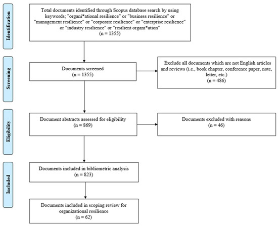 The Scopus online data repository was chosen for collecting the documents since it has broad coverage across different fields of study, such as management and education [33]. This review follows the Preferred Reporting Items for Systematic Reviews and Meta-Analyses (PRISMA) flowchart [34]. The searched string, “organi*ational resilience” or “business resilience” or “management resilience” or “corporate resilience” or “enterprise resilience” or “industry resilience” or “resilient organi*ation”, was used to conduct a keyword-based search for finding OR research publications in business and management literature.