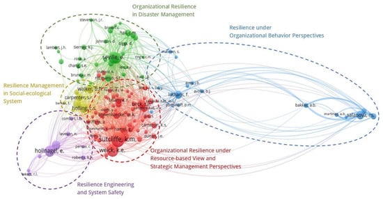 An author co-citation analysis was conducted to identify the intellectual structure of OR research in business and management literature. Through author co-citation analysis, five research streams emerged from the intellectual structure of OR research. Further, they are visualized as clusters on the author co-citation map exported from VOSviewer software. These research streams include (1) organizational resilience under resource-based view and strategic management perspectives, (2) organizational resilience in disaster management, (3) resilience under organizational behavior perspectives, (4) resilience management in social-ecological systems, and (5) resilience engineering and system safety. According to White and McCain [37], these schools of thought are the intellectual pillars of emerging literature in respective fields of study, which is the OR in business and management literature in this case (Figure 2).