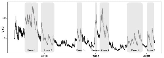 This part aimed to explore whether there was cyclical variability in systemic financial risk spillovers, and the evolutionary characteristics of financial risk spillovers when impacted by major events. With reference to historical data and the VaR measurement value, starting from the event outbreak period (set the absolute value of VaR higher than 6 for the first time) and based on the entire high-risk fluctuation period after the event, the major event period was identified. After determining the data stationarity, the ARMA model was used to fit the time series data of financial industry index returns, and the optimal order was ARMA (5, 5) considering the Akaike Information Criterion (AIC) and the Bayesian Information Criterion (BIC) comprehensively. Secondly, the Ljung-Box test was performed on the residual series, which showed that the financial industry index return time series had an ARCH effect, so the ARMA-GARCH family model could be used to fit it, and the VaR time series (absolute value) could be obtained. See Figure 1.
