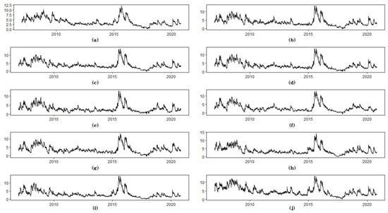 Risk spillover from the financial sector to the real industries: (a) Energy; (b) Materials; (c) Industrials; (d) Consumer Discretionary; (e) Consumer Staples; (f) Health Care; (g) Information Technology; (h) Telecommunication Services; (i) Utilities; (j) Real Estate.