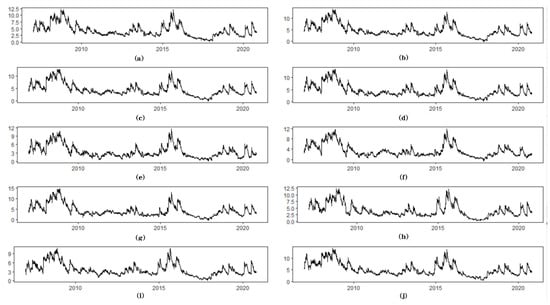 In order to explore the strength of the impact of the real entity industry on financial risk spillover on the financial industry. The %ΔCoVaR indicator was used to identify the systemically important entity industry. The ΔCoVaR time series represented the time-varying situation of systemic risk spillovers from the real entity industry to the financial industry, see Figure 3.