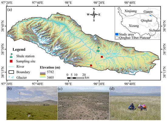 The study area is located in the Shule River headwaters in the western part of the Qilian Mountains (96.2°~99.0° E, 38.2°~40.0° N, and 3405~5827 m above sea level), northeast margin of the QTP, China (Figure 1). The total area is 4932.76 km2 and is characterized by a continental arid desert climate, with a low annual mean air temperature from −2.1 to −7.4 °C and precipitation from 360 to 600 mm [26]. This area belongs to the alpine ecosystem [27] and widely develops alpine permafrost. Alpine grassland in this area has been degraded over the past few decades [22]. Thus, a comprehensive ecosystem observation field was established in July 2014. Meanwhile, we selected around 500 acres of the surrounding area in which to sow seeds of local grasses. Before seeding, the soil was plowed to a depth of 20 cm, and 10 kg ha–1 of chemical fertilizer (diammonium phosphate) was applied. Revegetation completely excluded livestock grazing by fencing. Therefore, we chose an area inside the fence as a revegetated grassland site and an area outside the fence as an extremely degraded grassland site. In addition, an area of intact alpine meadow was selected as the control site. The description of the sampling sites was shown in Table 1. Mean annual air temperature and annual precipitation were calculated based on meteorological data of the observational sites in 2018.