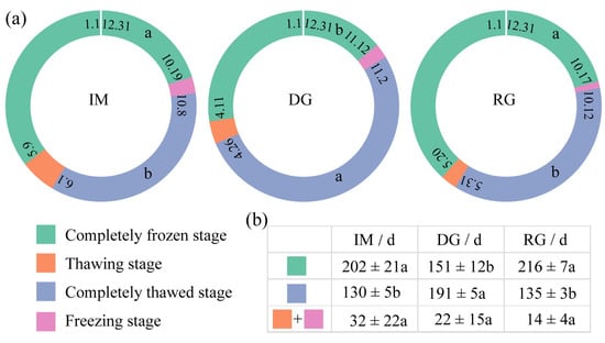 Soil freeze–thaw processes in intact alpine meadow (IM), extremely degraded alpine grassland (DG), and revegetated grassland (RG). The starting and ending dates of different stages (a), number of days in the completely frozen, completely thawed, and freeze–thaw stages (b). The numbers in the ring are time nodes (e.g., 1.1 means 1 January). Different lowercase letters indicate significant differences between sample sites at the level of 0.05.