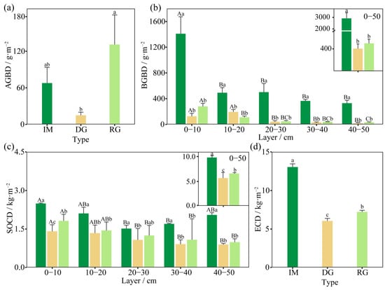Variations in the different carbon densities in intact alpine meadow (IM), extremely degraded alpine grassland (DG), and revegetated grassland (RG). Aboveground biomass carbon density (a), belowground biomass carbon density (b), soil organic carbon density (c), and ecosystem carbon density (d). Different lowercase and capital letters indicate significant differences among sample sites and soil layers in the same grassland at the level of 0.05, respectively.