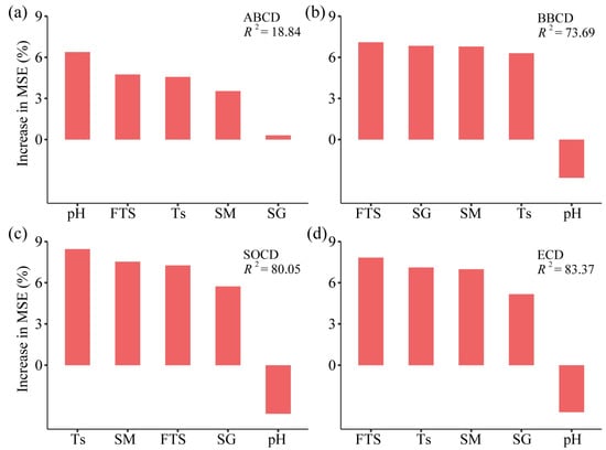 Two-way ANOVA revealed that the types of grassland insignificantly affected the ABCD (Table 3, p > 0.05). Soil layers, grassland types, and their interaction had a significant impact on both BBCD and SOCD (p < 0.05). The types of grassland significantly affected ECD (p < 0.001). The relative importance of predictor variations is shown in Figure 4. For ABCD, pH ranked first in importance, followed by freeze–thaw strength, soil temperature, moisture, and soil specific gravity. In contrast, the importance of pH for BBCD, SOCD, and ECD was relatively small. For BBCD, the difference in importance between freeze–thaw strength, soil specific gravity, and soil moisture was small, and soil temperature showed even less importance. For SOCD, soil temperature ranked first in importance, and the difference in importance between soil moisture and freeze–thaw intensity was small; soil specific gravity was less important. For ECD, the factor of the greatest importance was freeze–thaw strength, followed by soil temperature, moisture, and, finally, soil specific gravity.