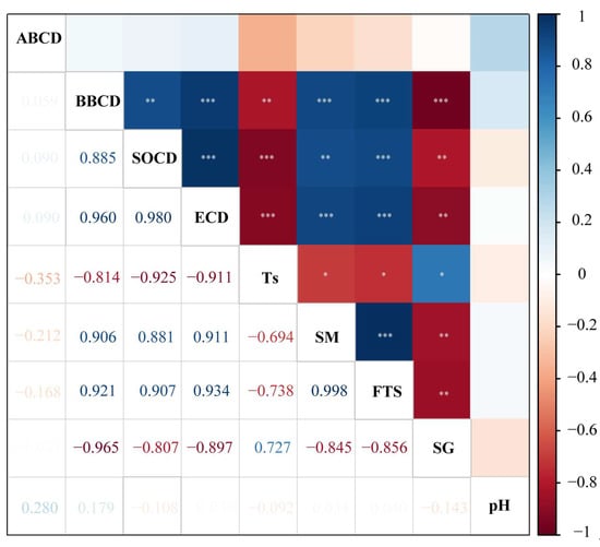 Heatmap of correlation (Pearson) between carbon density (ABCD, BBCD, SOCD, ECD) and environmental variables. Ts: soil temperature; SM: soil moisture; FTS: freeze–thaw strength; SG: soil specific gravity. * p < 0.05, ** p < 0.01, *** p < 0.001.