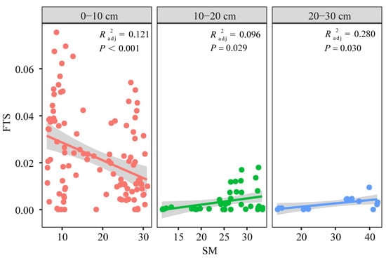 Comparisons of the soil moisture (SM) and freeze–thaw strength (FTS) at the depth of 0−30 cm. The lines are the regression equation, and the shaded areas represent the 95.0% confidence intervals of the regression equations.