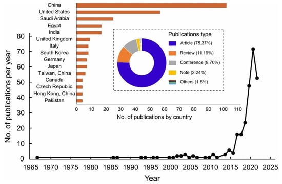 The bibliographic approach is the quantitative investigation of published scientific literature which focuses on the publication history, patterns of institutes and countries, research themes, specific areas/topics, and authors’ contributions in different journals [50]. In this paper, the data were retrieved from the database of Scopus by Elsevier on 31 May 2022. The time range was selected from 1967 to 2022 and these search terms were investigated (“Atmospheric water” OR “Water harvesting” OR “Water from air” OR “Water harvesting from air” OR “Atmospheric water generators”). According to the results, 8613 publications related to the search domain were identified in which the main document types were divided into articles (6579), conference papers (1358), reviews (280), book chapters (252), reports, letters, editorials, and short surveys (144). These research results were further restricted to the adsorption-based AWH publications by incorporating these terms in the search query (“Desiccant” OR “Adsorbent” OR “Sorbent” OR “Adsorption”). Among these results, 268 publications were identified that met this search criterion. The results showed that ~95.1% of the articles were published in the English language, followed by Chinese with ~4.1%. Overall, the publishing trend for these articles is presented in Figure 3 in which the number of publications per year has increased since 2015, which clearly shows that the researchers started taking interest in this field. From 1967 to 2010, the annual publications on this search query were similar, and very limited articles were published every year. From 2010 to 2022, there was an obvious increase in the number of publications per year. Viewing these articles, 45 countries or regions published at least one article on this topic of adsorption-based AWH. As shown in Figure 3, the China and United States published the highest number of articles compared with other regions of the world and accounted for ~59.7% of the total publications. According to these results, over 160 affiliations took part in publishing articles in which the Shanghai Jiao Tong University holds the highest position.