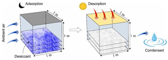 A solar-driven adsorption-based AWH system with a volume of 1m3 was assumed in this study in which a constant airflow was present. Figure 5 shows the schematic of the proposed system that performs adsorption, desorption, and condensation processes. The water-harvesting phenomenon in the system comprises (i) water vapor adsorption at night (at low temperature and high relative humidity), (ii) water vapor desorption during the day (at a high temperature within the confined space), and (iii) water vapor condensation (at low temperature). In the literature, several desiccant materials have been proposed for AWH including silica gel, zeolites, metal–organic frameworks (MOFs) covalent organic frameworks (COFs), and other organic and inorganic materials of hygroscopic nature [37,52,69,70,71]. In this analysis, microporous desiccant materials (i.e., silica gel and zeolite), one MOF of the highest water adsorption capacity (MIL-101 (Cr)), and one COF with the lowest activation energy (COF-432) were studied to evaluate the AWH potential across Pakistan. Table 2 represents the selected desiccant materials’ properties where the adsorption isotherm data of MIL-101 (Cr) and COF-432 were used directly from the literature [69,72,73].