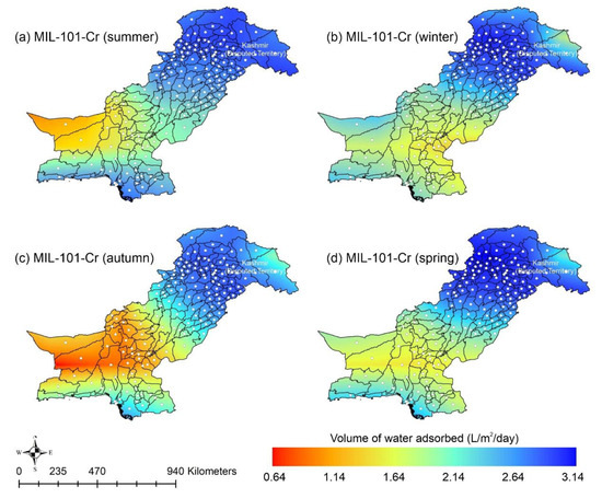 Season-wise geospatial mapping showing the adsorption-based AWH potential by MIL-101-Cr across Pakistan.