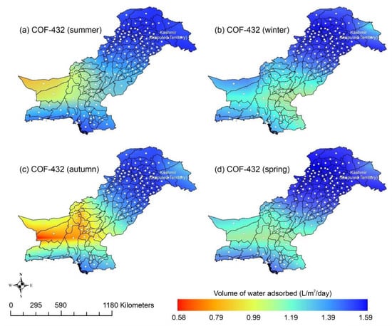 Season-wise geospatial mapping showing the adsorption-based AWH potential by COF-432 across Pakistan.