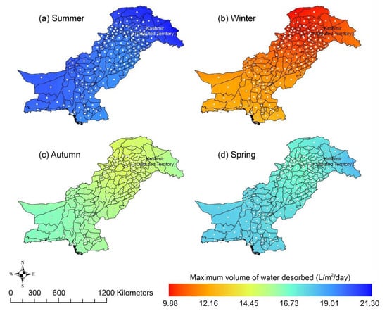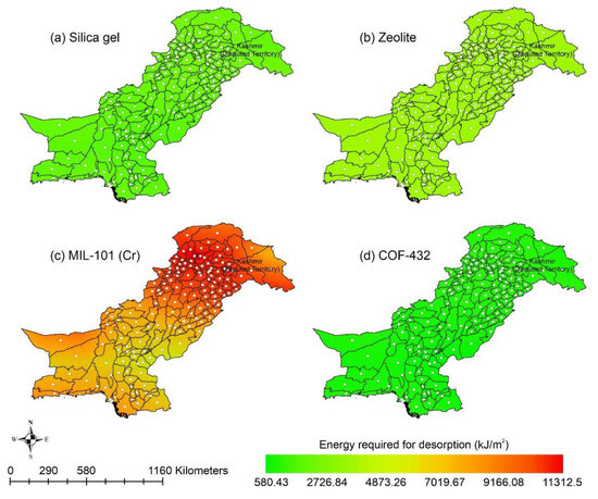 Other adsorbent materials such as zeolite, MOF, and COF could potentially address this shortcoming. Figure 7 shows the AWH potential of zeolite across Pakistan. It can be seen that the zeolite has a constant WHR (i.e., 0.89 to 0.94 L/m2/d) across Pakistan. The slightly lower values of WHR (i.e., 0.83 to 0.85 L/m2/d) occur in the dry Western Plateau region in the autumn season. The maximum water production occurs for MIL-101 (Cr). Figure 8 shows the AWH potential of MIL-101 (Cr) across Pakistan. In summer, northern dry and wet mountains (in Azad Jammu and Kashmir and parts of Khyber Pakhtunkhwa) along with northern irrigated plain areas show the highest WHR (i.e., 2.64 to 3.14 L/m2/d) by MIL-101-Cr. Furthermore, the southern irrigated plain, Suleman Piedmont, western dry mountains, and sandy desert areas of Pakistan deliver less WHR (i.e., 1.64 to 2.64 L/m2/d) in summer. MIL-101 (Cr) produces WHR (i.e., 0.64 to 1.64 L/m2/d) in summer and autumn, and WHR (i.e., 1.64 to 2.14 L/m2/d) in winter and spring for the dry Western Plateau region of Pakistan. Figure 9 shows the AWH potential of COF-432 across Pakistan. According to Figure 9, COF-432 follows the same geospatial trend as other desiccant materials by producing the maximum WHR (i.e., 1.39 to 1.59 L/m2/d) in northern areas of Pakistan. Concerning the adsorption isotherms of silica gel and zeolite, both are promising candidates for AWH in arid regions (i.e., RH < 40%), whereas MIL-101 (Cr) is useful in those regions where RH > 40%. On the other hand, COF-432 shows a water adsorption isotherm without hysteric behavior and with a steep step at low relative humidity (i.e., RH < 40%). Although the WHR of COF-432 is less than the MIL-101 (Cr), its other factors such as highest water adsorption cycling stability, low regeneration energy barrier, and low heat of adsorption have already established it as the most suitable desiccant material for AWH in the literature [69]. The desorption energy of individual desiccant material was calculated using Equation (9). Figure 10 shows the desorption energy requirements for selected desiccants. According to Figure 10, silica gel and COF-432 materials show desorption energy requirements in the range of 580 to 2726 kJ/m2, whereas zeolite requires from 2726 to 4873 kJ/m2. Additionally, MIL-101 (Cr) requires the highest desorption energy which varies from 7000 to 11,312 kJ/m2. The available solar irradiance in Pakistan can only desorb the adsorbed water vapor molecules from the silica gel, zeolite, and COF-432 completely. However, for MIL-101 (Cr), the available solar irradiance can only desorb the adsorbed water vapor molecules in the summer season, whereas around half a fraction of adsorbed water could be desorbed in the remaining seasons. Therefore, the volume of water desorbed by available solar energy was calculated for MIL-101 (Cr) using Equation (10). The volume of water desorbed from MIL-101 (Cr) by available solar energy in the winter season varies from 1.52 to 1.60 L/m2/d in the northern dry and wet mountains along with the northern irrigated plain. However, the volume of water adsorbed by MIL-101 (Cr) in winter varied from 2.64 to 3.14 L/m2/d (Figure 8) in Mountainous ranges. It was seen that solar energy limits the AWH potential yield; therefore, the maximum volume of water that can be desorbed by available solar thermal energy can be calculated across Pakistan. Furthermore, regions with limited solar radiation should consider alternative off-grid sources (i.e., wind and geothermal) for the desorption of water vapor molecules. In this study, Equation (11 was applied to calculate and map the AWH potential as a function of available solar energy and Edes of 10 kJ/mol, which is the Edes of COF-432. However, the maximum AWH potential can also be mapped for silica, zeolite, and MIL-101 (Cr) by defining their respective activation energies. Figure 11 shows the maximum AWH potential as a function of desorption across Pakistan. According to Figure 11, the AWH potential is highest in summer with WHR varying from 19.01 to 21.30 L/m2/d, 16.73 to 19.01 L/m2/d in spring, 14.45 to 16.73 L/m2/d in autumn, and 9.88 to 12.16 L/m2/d in winter across Pakistan. These calculations show that the suitable way to choose a desiccant material for solar AWH is to first analyze solar desorption potential rather than the desiccant’s adsorption properties.
