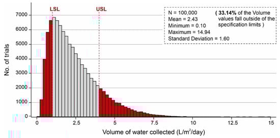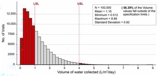 The results of AWH potential based on the selected desiccant materials (i.e., silica, zeolite, MIL-101 (Cr), and COF-432) are mapped in Figure 6, Figure 7, Figure 8, Figure 9, Figure 10 and Figure 11; however, in the literature, a number of different desiccant materials have been developed for AWH. Furthermore, the output results were limited owing to the selected material properties. Therefore, Monte Carlo simulations were performed to highlight the effects of different combinations of material properties to maximize the AWH potential within the conceptual system. The number of random combinations of the independent variables was generated against the volume of water adsorbed (L/m2/d) using Equation (8). A probability distribution of 100,000 trials was performed to achieve the desired specification limits of 1–4 L/m2/d based on the values assigned in Table 3. Figure 12 shows the cumulative AWH potential of a proposed system where the y-axis shows the number of combinations producing a volume of water adsorbed (indicated on the x-axis). The lower specification limit (LSL) and upper specification limit (USL) are the acceptable values for a variable or a process, and in this case, it was set to 1–4 L/m2/d. According to Figure 12, ~55% (54,912) combinations of independent variables yielded less than 1 L/m2/d of output, whereas ~45% (45,088) of combinations yielded more than 1 L/m2/d of the volume of water. It is worth mentioning that ~56.4% of combinations of the volume results fall outside of the desired specification limits. Additionally, Figure 13 shows the marginal distribution of the volume of water adsorbed (L/m2/d) in a system against the combinations of independent parameters (SSAD, SSDD, ρD, kL, h, and dD). According to Figure 13, the proposed adsorption-based AWH system achieved a maximum volume of 8.88 L/m2/d with a mean value of 1.15 L/m2/d. It is worth mentioning that histograms (green and red color) in the marginal plotting represents the frequency of x and y values to visualize the distribution of both the axes.