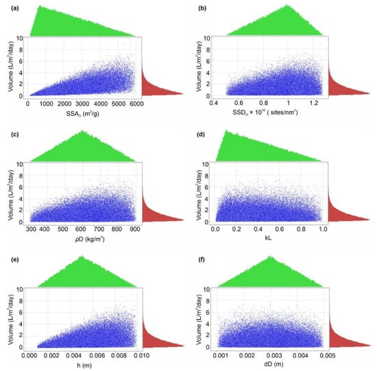 Marginal plotting of volume of water produced (L/m2/d) by the AWH system, calculated by Monte Carlo simulations over 100,000 trials against (a) SSAD (specific surface area), (b) SSDD (specific site density), (c) ρD (bulk density), (d) kL (Langmuir constant), (e) h (bed depth), and (f) dD (desiccant diameter).