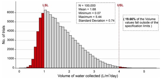 Monte Carlo simulation is extremely flexible and a valuable tool to model and simulate any system that can be influenced by random numbers. The number of random scenarios is generated and gathered to finalize the system performance. In this study, the Monte Carlo simulation was performed to understand the AWH potential within the conceptual system volume. A range of possible outcomes of the volume of water was generated along with the independent parameters. A triangular distribution was assigned to each independent parameter because it performs better when limited data are available to perform statistical modeling to fit a specified probability distribution [83,84,85]. The probability distribution of 100,000 trials was performed based on the provided lower, mode, and upper values in the probability distribution. Table 3 shows the independent parameters with a range of values assigned in triangular distribution for AWH. The possible outcomes of the volume values were calculated by random sampling of the independent parameters within their probability distribution. Furthermore, the parameter optimization and sensitivity analysis were performed to finalize the boundary conditions of the solid desiccant-based AWH system by ensuring the maximum number of outcomes of the volume values within the desired specification limits of 1–4 L/m2/d, by keeping in mind the individual’s drinking water needs of about 15.5 cups (3.7 L).