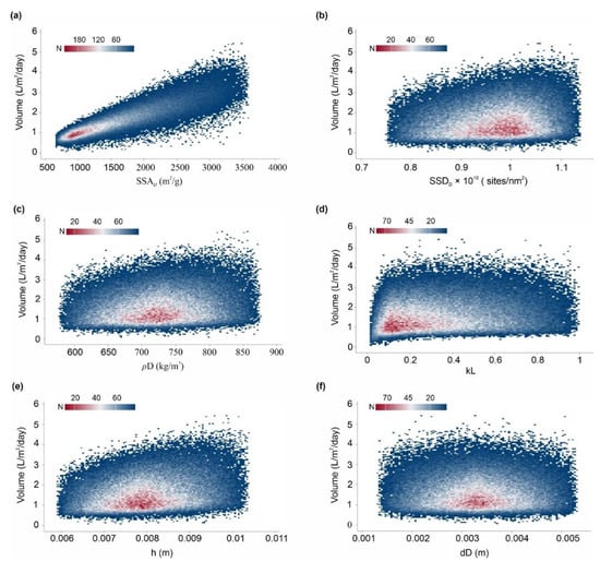 Binned scattering of the volume of water collected by the AWH system after sensitivity analysis, calculated by Monte Carlo simulations over 100,000 trials against (a) SSAD (specific surface area), (b) SSDD (specific site density), (c) ρD (bulk density), (d) kL (Langmuir constant), (e) h (bed depth), and (f) dD (desiccant diameter).