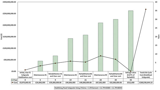 | 6 | 2% L + 2.5% C + 11.75% GGBS + 11.75% BDW | 16–109 | 0.0028 | GBP268,536,644.10 | GBP488,754,774.64 |