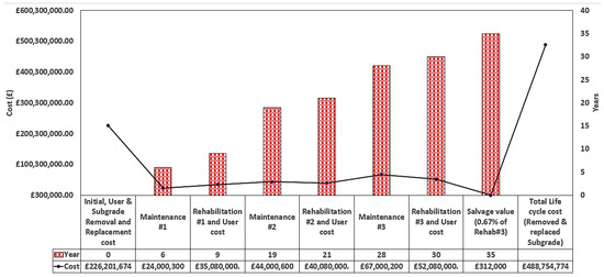 - The Life Cycle Cost (LCC) of a road is greatly influenced by the initial cost such as agency, user cost and subgrade treatment cost. Year 0 to year 19 observed a gradual increase in maintenance and rehabilitation costs as road pavement age increased. Followed by a reduction in rehabilitation cost in year 21 with an increase in maintenance cost in year 28. Both road pavements recorded the same salvage value.