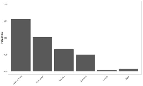 More than half (57%) of SCM growers (n = 63) sold their products through four or more sales outlets (Table 1). The most common outlets for selling SCMs were farmers’ markets (75%), restaurant/food trucks (68%), and grocery stores (54%) (n = 63) (Figure 1). Seventy-three percent of growers (n = 62) reported they had adequate access to consumers. This was supported by the findings that 75% of SCM growers (n = 63) sold 81–100% of their fresh mushrooms, while 14% sold 61–80% respectively. Most growers who did not sell all their SCMs (n = 51) processed them (68%) or gave them away to family/friends/employees (48%) (Figure 2). The most common sales outlets for consumers to purchase their SCMs were grocery stores (87%), farmers’ markets (30%), and restaurants/food trucks (27%) (n = 30).