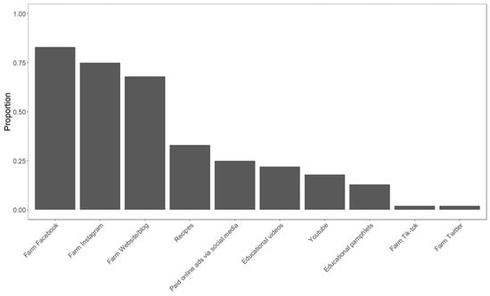 The majority (53%) of growers (n = 60) used diverse (four or more) approaches to advertise their products (Table 1). The most common advertising methods used were social media sites, specifically Facebook (83%) and Instagram (75%), as well as a farm website/blog (68%) (n = 60) (Figure 3). Twenty-four percent of growers (n = 62) indicated that they did not have an adequate understanding of the demand for their products, while 31% expressed difficulties with advertising their products in general. Some of the most common marketing messaging SCM growers (n = 59) used to promote their products included supporting local food systems (86%), health/nutritional benefits (84%), and growing practices (84%) (Table 2).