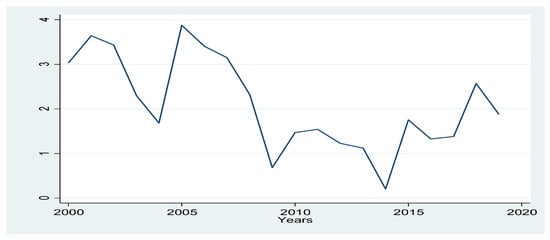 FDI inflow as a percentage of GDP as shown in the trend line of Pakistan during 2000–2019 in Figure 1 indicates a decreasing pattern during 2001–2004. However, it moved upward during 2005. The figure further indicates that after 2005 until 2014, a decreasing trend in FDI inflow for the economy of Pakistan was witnessed. However, it started moving upward after 2014, which still persists. The past studies carefully analyzed and compared all these trends of FDI inflow in Pakistan [4,5,6].