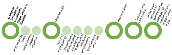The research follows on from several surveys of the research team [3,6,7,20], which were devoted to ecological innovations from different points of view; in this research we focused on the perception of ecological innovation evaluation from the point of view of sustainability in Slovakia, focusing on elementary characteristics of sustainability through ecological innovations in households. The elementary characteristics of sustainability through ecological innovations in households are understood as the characteristics associated with the parameters that burden the domestic budget of Slovak households the most, besides food. These expenses include energy, housing and transport [21]. The research itself consists of several steps, which are shown in the road map of the future research, Figure 1.