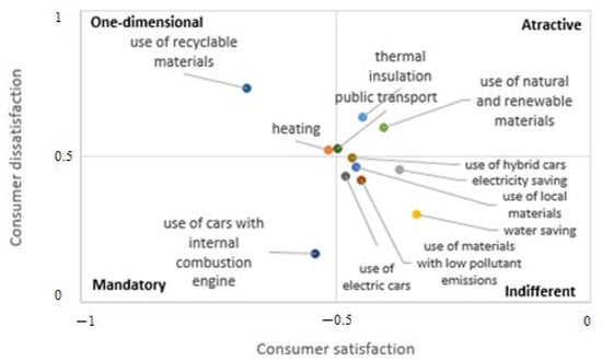 Indifferent requirements not influencing the consumers’ satisfaction and dissatisfaction are as follows: use of materials with low pollutant emissions, use of electric cars, use of hybrid cars, electricity saving, water saving and use of local materials. This attitude essentially represents opposites to the requirements that affect consumers. For example, electro-mobility does not affect Slovak respondents, as the infrastructure of elements such as charging stations [50] is not sufficiently built in Slovakia. Cars with combustion engines are more affordable in Slovakia [51]. This also affects the preference for cars with an internal combustion engine—a mandatory requirement. We can also assume that this is also the case for the other investigated parameters because saving water and using local materials are influenced by sufficient supplies of natural resources (byproducts)—wood, forest and water resources. At the same time, the energy reserves of fossil fuels in Slovakia do not represent a significant position and are dependent on imports. Nowadays, the availability of fossil fuels is becoming a worldwide problem, and equivalent substitutes with available ecological solutions are being sought. Slovakia can be involved in the solution of possible alternatives because it has considerable renewable and at the same time ecological resources, which soon will begin to be reached and will certainly also be practically used [52].