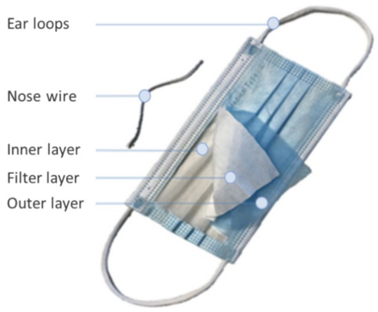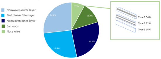 Generally, DSMs are classified as “FFP1” masks according to the EU standard EN149 and are also known by the code N95, as they can achieve 95% filtration of particles with a diameter of 0.3 μm. They are composed of five parts [9] that include ear loops, nose wire, and three layers of microfibers or nanofibers, which are hydrophobic, skin-friendly, and non-allergenic (Figure 1). The filter layers are usually produced using melt-blown electrospinning technology. All three layers can be made from a variety of synthetic polymeric materials such as polypropylene, polyurethane, polyacrylonitrile, polystyrene, polycarbonate, polyethylene, or polyester, depending on the customer’s preference [5,7]. However, as it is a plastic product, it is expected that after usage, in the form of waste, it will have further negative impact on the already polluted environment [5,9].