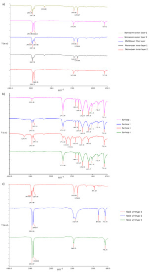 (a) FTIR spectra of 3-layered part of DSM; (b) FTIR spectra of different ear loops; (c) FTIR spectra of nose wires.