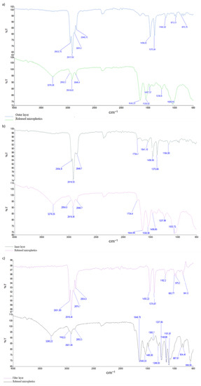 In the case of nose wire examination, the metal wires were removed first, and then only the plastic coating was analyzed. As already schematically shown in Figure 2, three different types of nose wires were found according to their structure. As they differ in structure, they also differ in the FTIR spectra obtained. Type 1 was a nose wire with a metal wire in a plastic coating. As can be seen in Figure 3c, the spectra of type 1 have peaks typical for polypropylene, and the position of bands is very similar to the spectra of the coatings of polypropylene in Figure 3a. Type 2 and type 3 nose wires’ spectra are very similar, and they are compared with the spectra in Figure 3a, as they are also comparable to the inner and outer layer of DSMs made of polyethylene. Indeed, among all nose wires examined, the material polypropylene predominates.