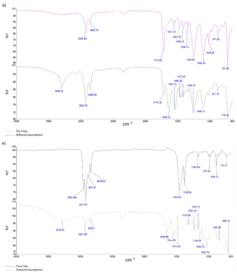 The FTIR spectra of the microplastic produced during the TCLP differ from the FTIR spectra of the base parts of the surgical masks (refer to Figure 3). The FTIR spectra of microplastic release from the outer, inner, and filter layers (Figure 4a–c) and also from the nose wire (Figure 4e) are not consistent with the spectrum of polypropylene, showing new peaks around 3300 cm−1, 1650 cm−1 and peaks in the range of 1030–1060 cm−1. The peaks in the range from 3000 to 2800 cm−1, which are due to asymmetric and symmetric stretching vibrations of the CH2 and CH3 groups of polypropylenes, are less pronounced and the peaks at 1456 and 1376 cm−1 disappear completely in the spectra of the released microplastic. From this, we can conclude that polypropylene undergoes oxidation/degradation reactions that were confirmed with the appearance of new bands after the TCLP [16,18]. The new peak around 3300 cm−1 may correspond to hydroxyl groups, while the peaks in the range of 1030–1060 cm−1 may represent signals for C-O stretching vibrations [16]. The FTIR spectrum of microplastic released from ear loops (Figure 4d) differs from the polyamide 6 spectrum in the following two peaks: peak at 3295 and peak at 1635 cm−1. The latter may also be attributed to the oxidation process of polymeric material [16,18].