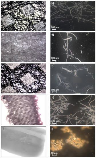 The microplastic particles in Figure 5b,d,f,h are quite similar. Most of the particles are fibers that are uniformly distributed and not superimposed. Some fibers are fragmented into particles and broken, which look like irregular spheres and cubes and are no longer fiber-like, as initial layers. Such morphology and shape of fiber-forming particles are expected because of the material from which they are leached (Figure 5a,c,e,g). In Figure 5j, the leached microparticles are different from those in the previous photographs. In this case, the particles are dislodged from nose wires (Figure 5i) and are made of hard polypropylene. The slightly orange color is probably the result of the presence of metal wire. It was shown in [15] that when other particle shapes and morphologies were compared to fiber-shaped particles, it was revealed that the latter in general tends to cause larger ecotoxicological effects.